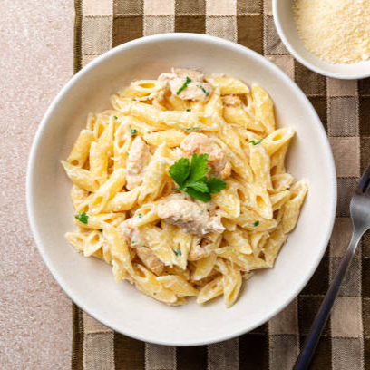 Macarrão Penne ao Molho de Strogonoff de Frango com Mussarela Ralada