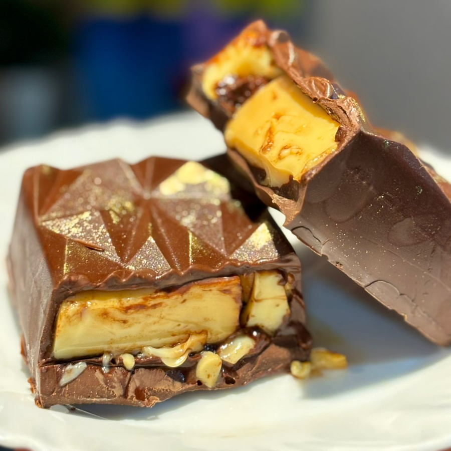 Uma deliciosa barra de chocolate recheada com o nosso cremoso pudim, feita para surpreender em cada pedaço. Doçura, cremosidade e aquele sabor que abraça o coração. Perfeita para presentear… ou para se presentear também. Aprox. 300g