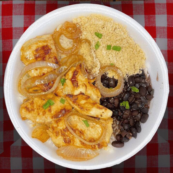 Marmita com delicioso bife de filé de frango acompanhado de arroz branco, farofa caseira e feijão preto. Marmita indicada para 01 pessoa.