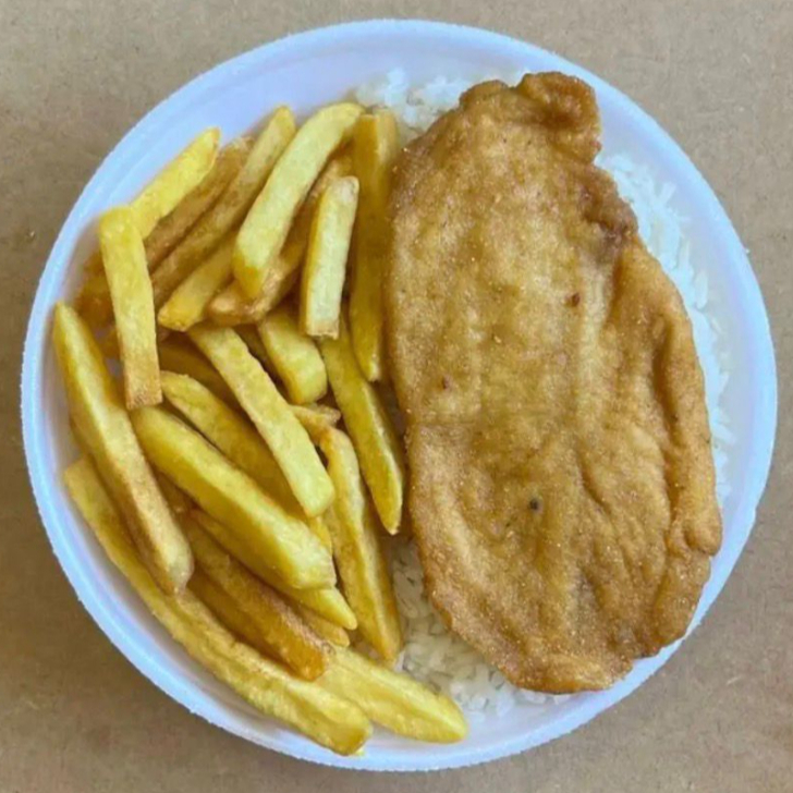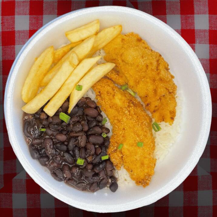 Marmita com delicioso filé de frango empanado na massa crocante acompanhado de arroz branco, feijão e batatas fritas. Marmita indicada para 01 pessoa.