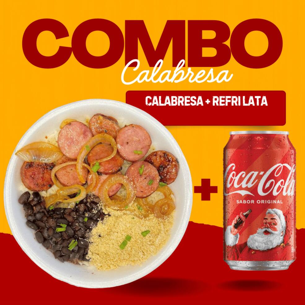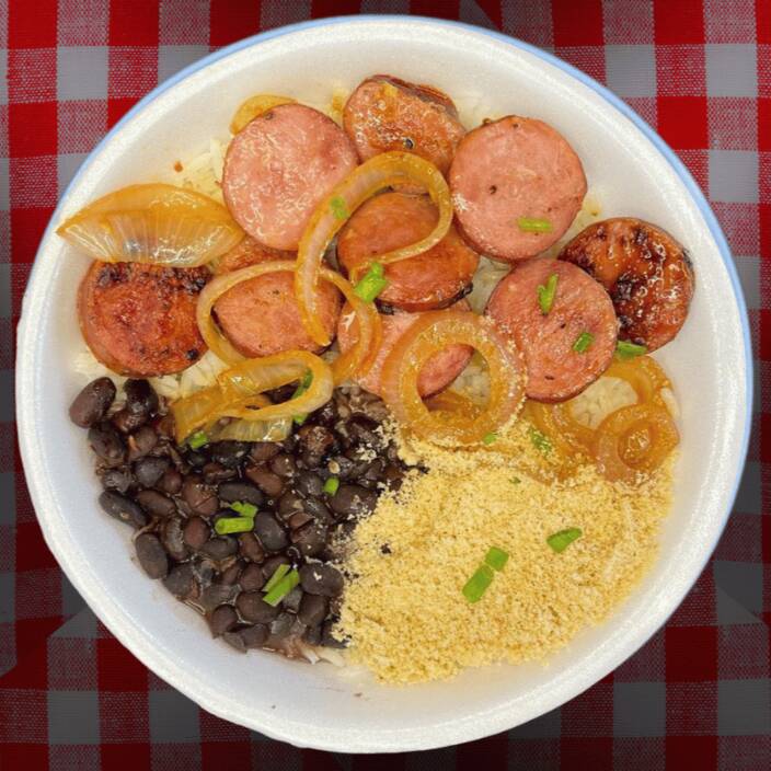 Marmita com deliciosa calabresa acebolada acompanhado de arroz branco, farofa caseira e feijão preto. Marmita indicada para 01 pessoa.