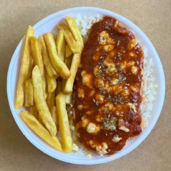 (Parmegiana C/ Fritas) Marmita com delicioso filé de frango parmegiana (empanado na massa crocante coberto com molho de tomates e queijo) acompanhado de arroz branco e batatas fritas. Marmita indicada para 01 pessoa.