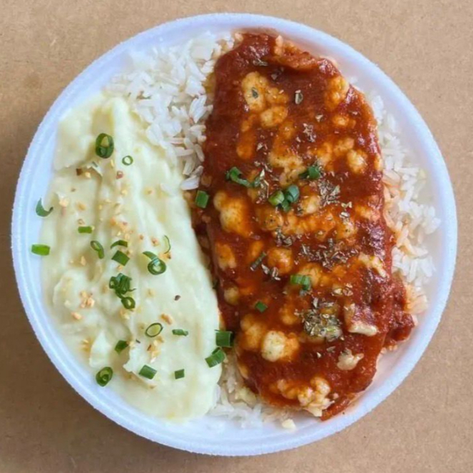 (Parmegiana C/ Purê) Marmita com delicioso filé de frango parmegiana (empanado na massa crocante coberto com molho de tomates e queijo) acompanhado de arroz branco e purê de batatas inglesas. Marmita indicada para 01 pessoa.
