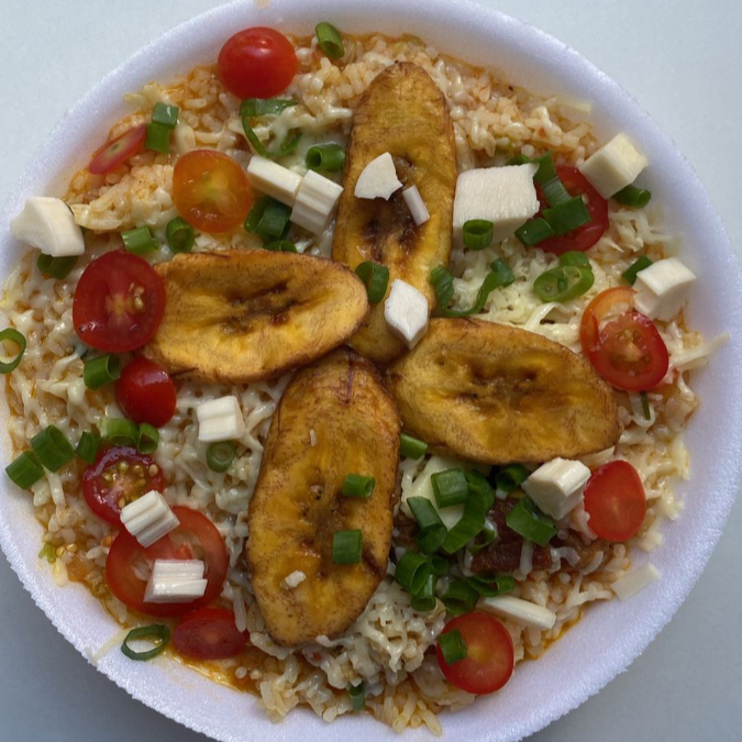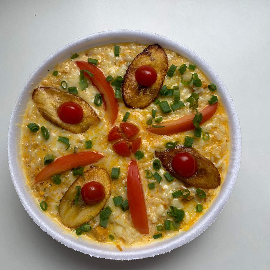 acompanha arroz, file de frango em cubos, linguicinha de frango, requeijao cremoso, banana frita, mussarela, tomate e cebolinha