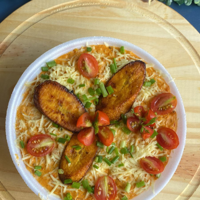 acompanha arroz, carne de sol em cubos, linguicinha calabresa, requeijao cremoso, banana frita, mussarela, tomate e cebolinha