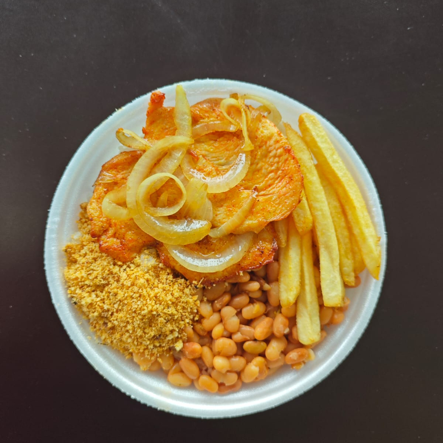 Marmita 500ml- Arroz soltinho, frango empanado crocante, fritas, molho caseiro e queijo derretido!