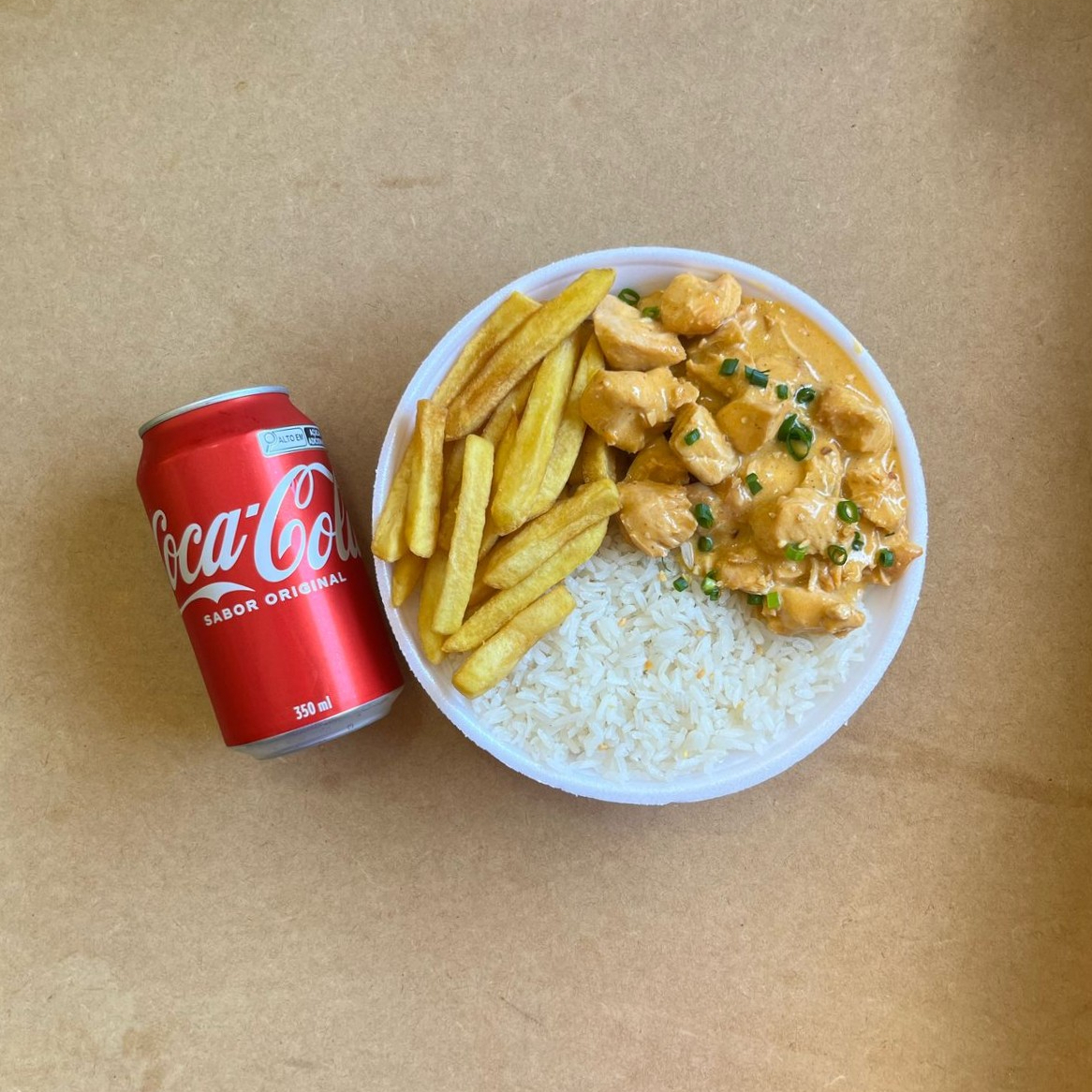Marmita com delicioso filé de frango ao molho estrogonofe acompanhado de arroz branco e batatas fritas.. Acompanha refrigerante lata Coca Cola 350ml bem gelada. Marmita indicada para 01 pessoa.