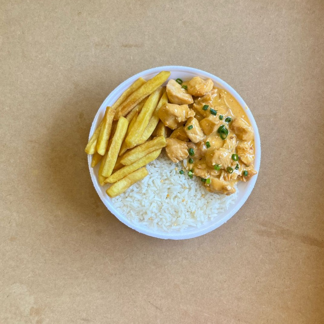 Arroz soltinho no alho, strogonoff de frango cremoso e batata palha separada.