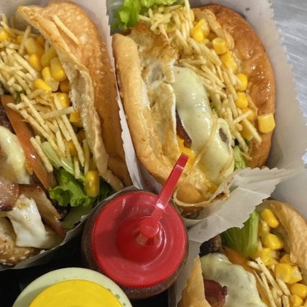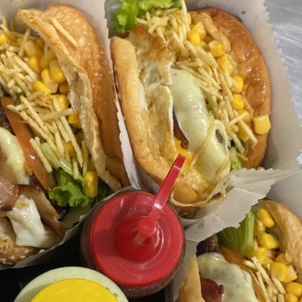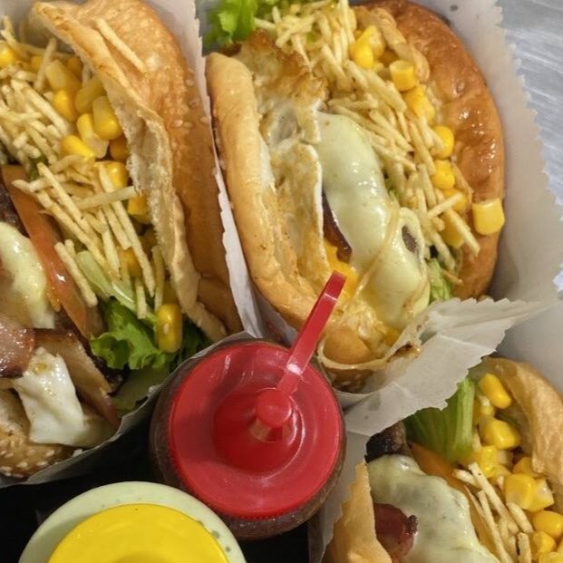 Pão, carne, Mussarela, bacon, milho, batata e salada.