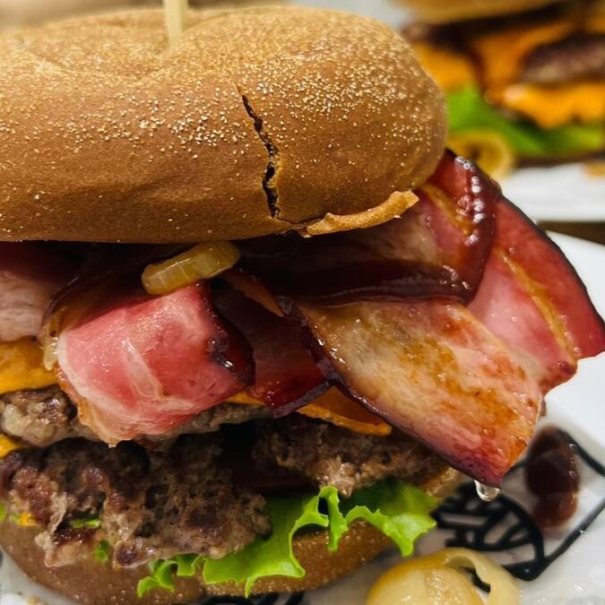 Pão australiano, 1 hambúrguer 150gr, 1 cheddar, cebola caramelizada, barbecue e salada.