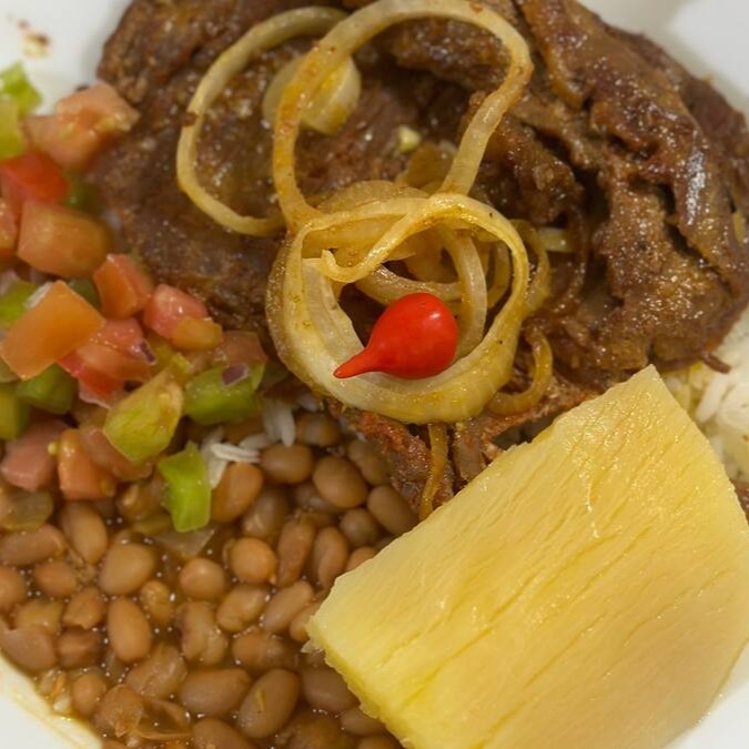 Arroz bem soltinho , Feijao Tropeiro bem recheado Ou De Caldo, tudo com tempero caseiro de verdade, Mandioca bem cozidinha, saladinha E Bife de alcatra bem macio.