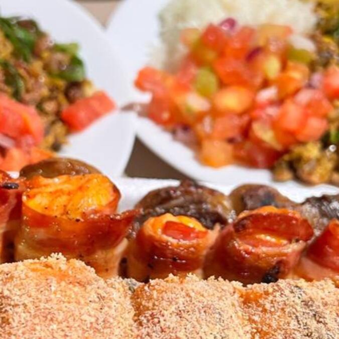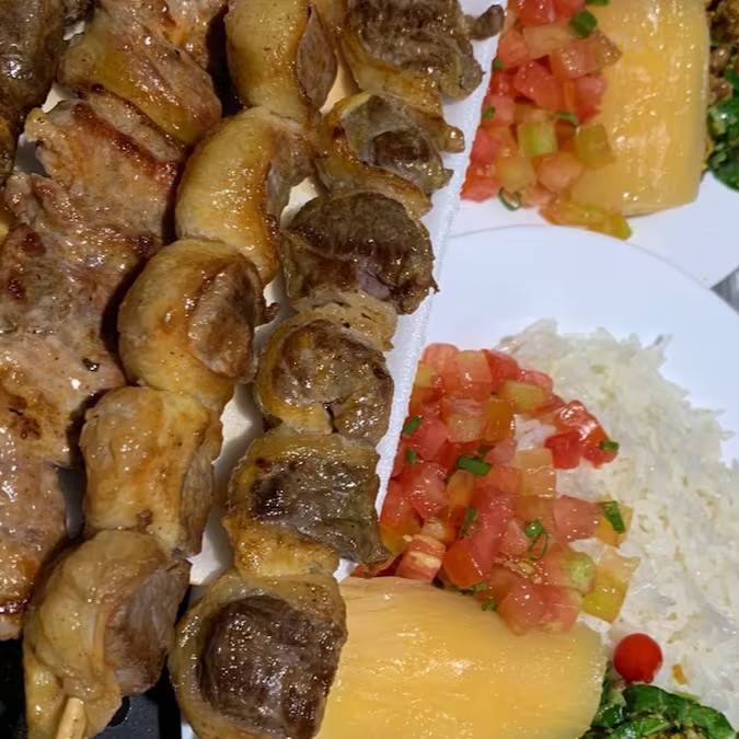 Delicioso arroz soltinho, feijão tropeiro bem recheado ou feijão de caldo tudo com tempero caseiro de verdade, mandioca bem cozinha, saladinha e espeto suculento.