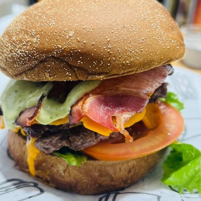 Pão australiano, 1 hambúrguer 150 gr, 1 cheddar, bacon, molho ervas e salada.