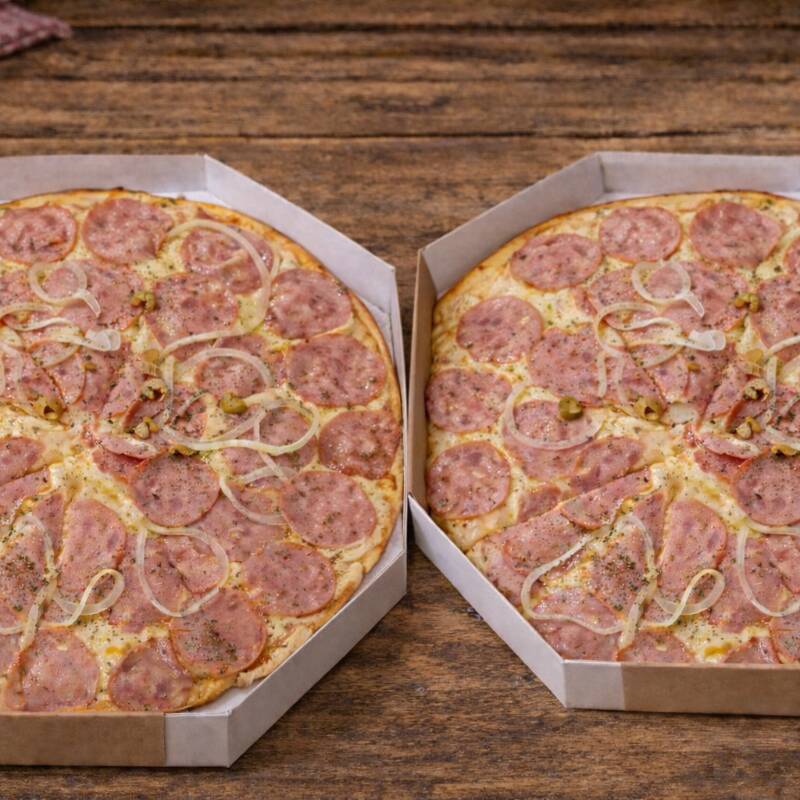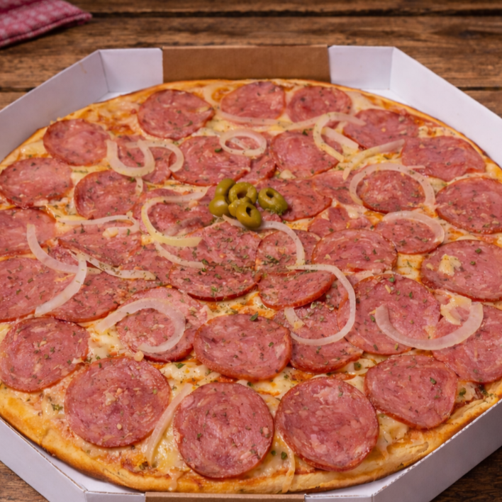 Massa tradicional, molho de tomate, DOBRO mussarela, DOBRO calabresa, azeitonas, CEBOLA e orégano. (para retirar algum ingrediente escrever no campo observação! EX: SEM CEBOLA)