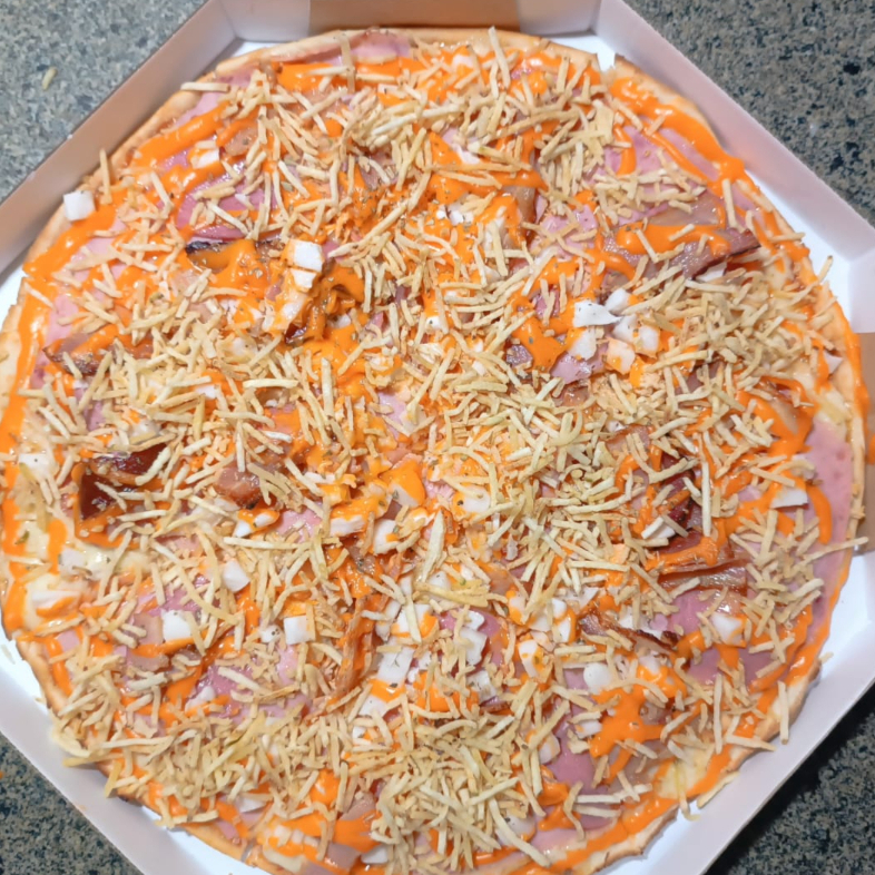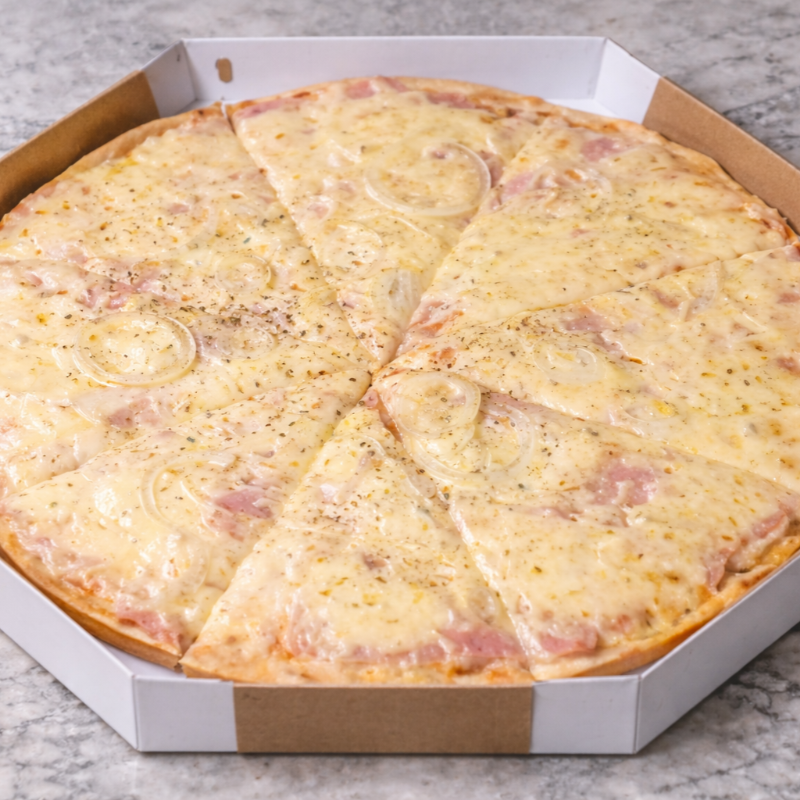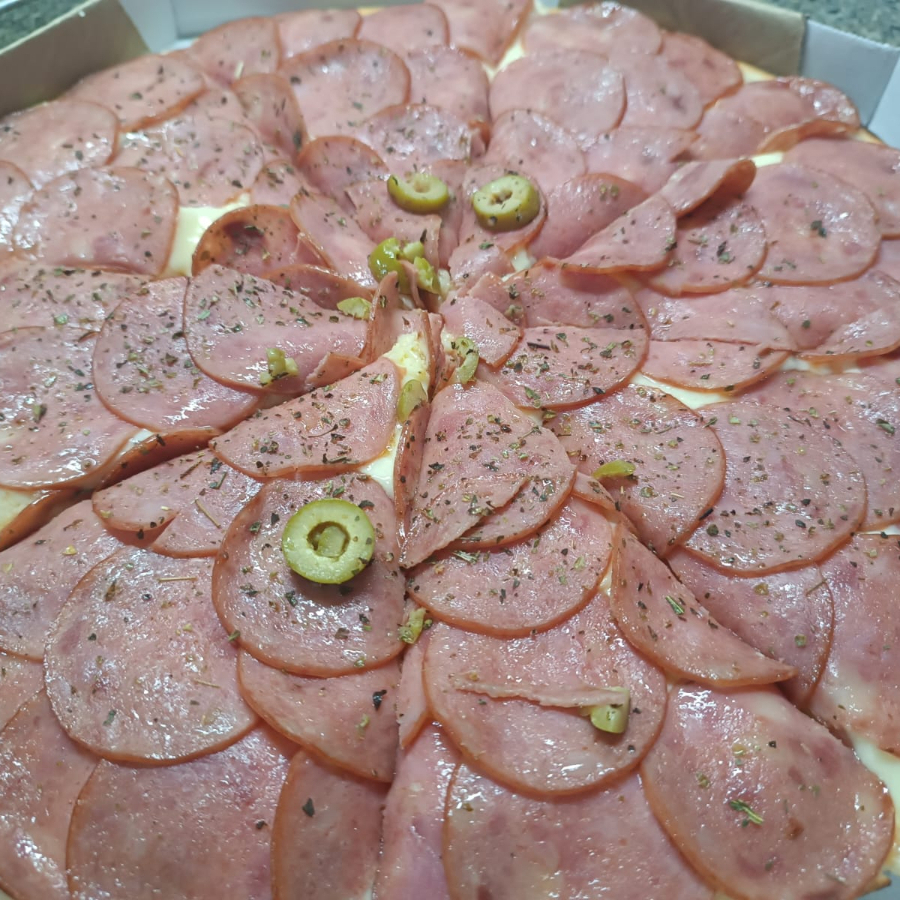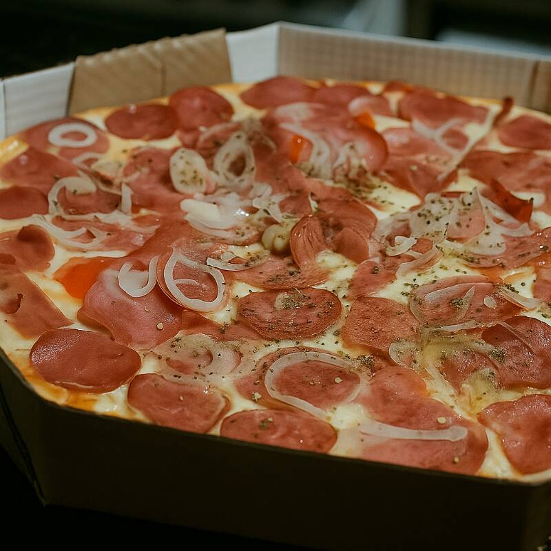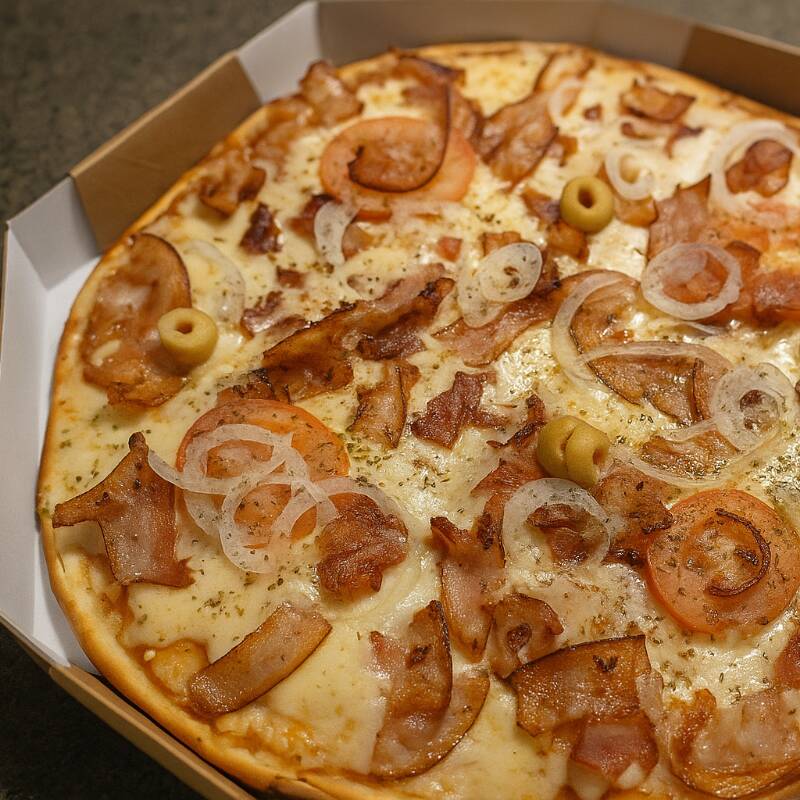MASSA TRADICIONAL, MOLHO DE TOMATE, MUSSARELA, PRESUNTO, CALABRESA, BACON, CHEDDAR CREMOSO, BATATA PALHA E OREGANO