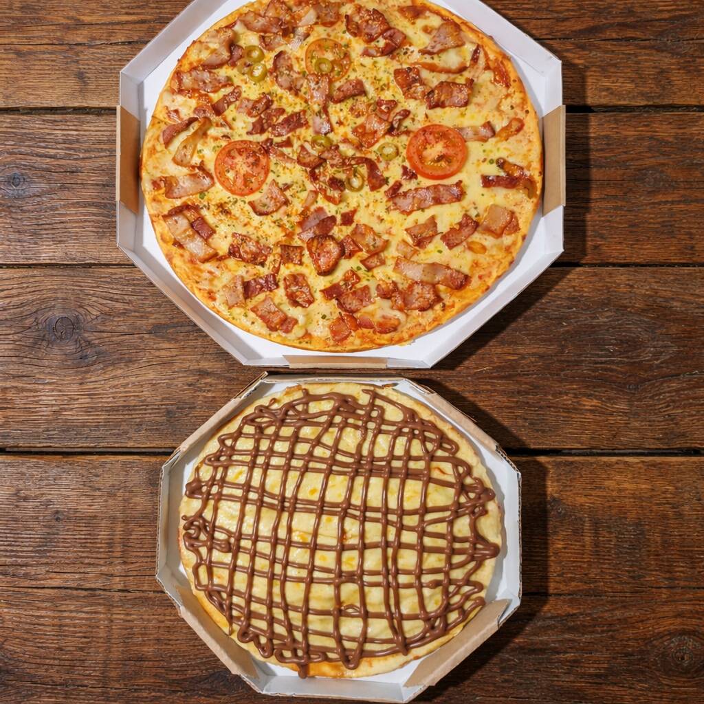 1 Pizza Grande De Bacon + 1 Pizza Pequena De Chocolate Com Mussarela
