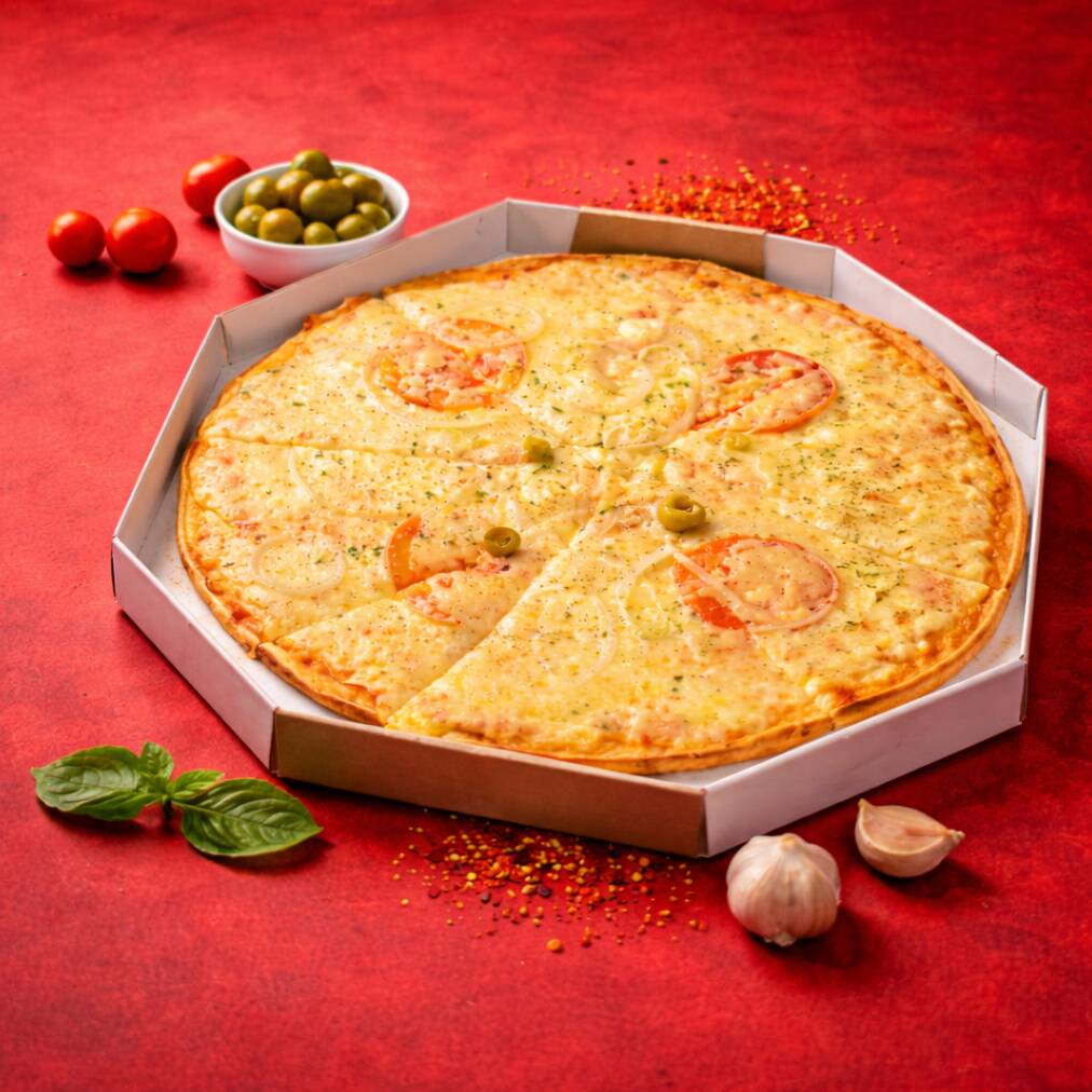 MASSA TRADICIONAL, MOLHO DE TOTMATE, MUSSARELA, CALABRESA, AZEITONA E OREGANO