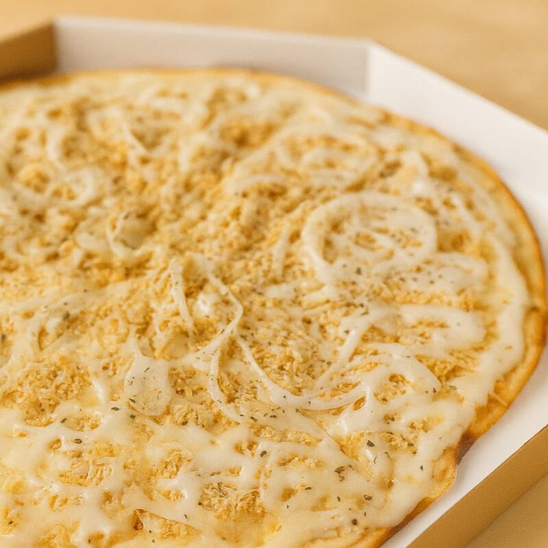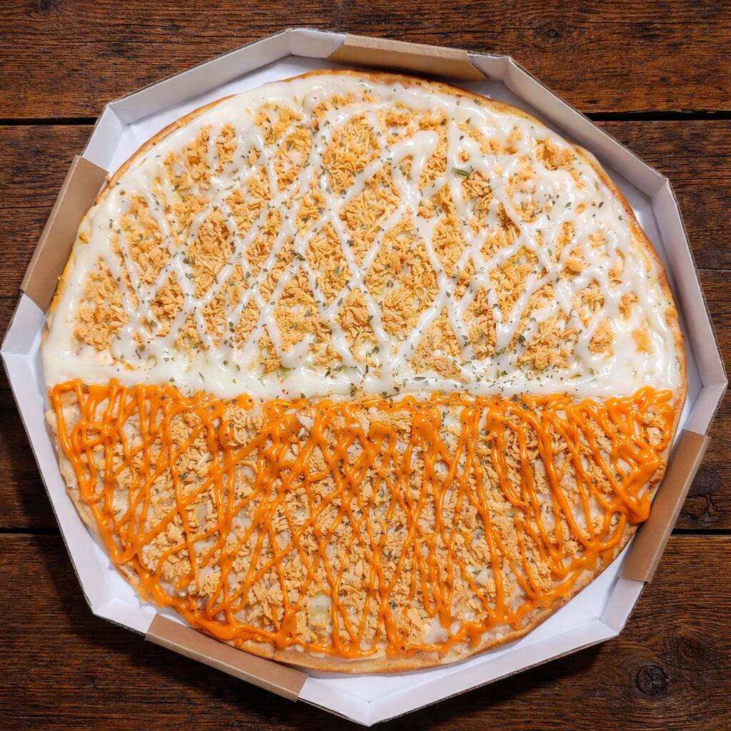 MASSA TRADICIONAL, MOLHO DE TOMATE, MUSSARELA, FRANGO DESFIADO, REQUEIJÃO GREMOSO E OREGANO