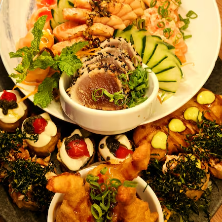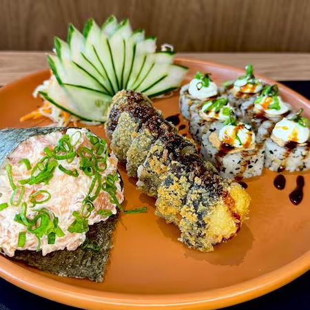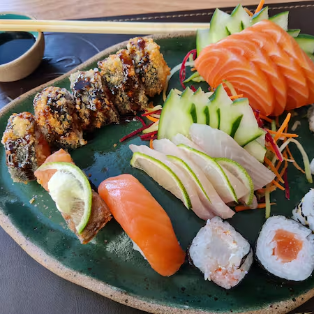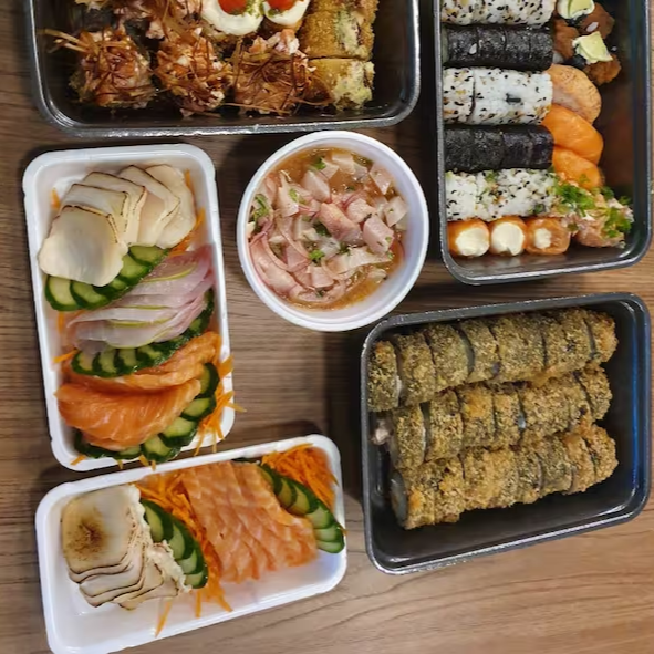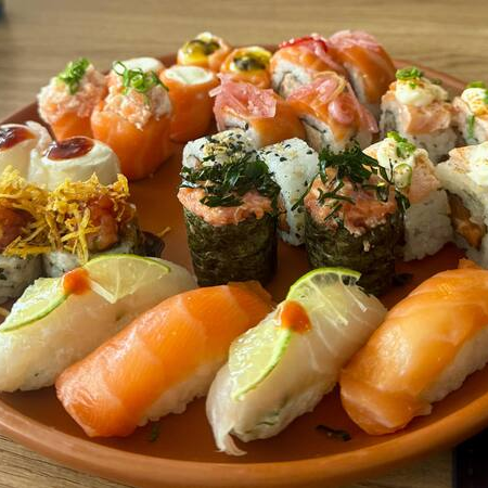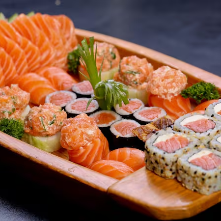 "Experimente uma deliciosa combinação com 6 sashimis frescos (3 de salmão e 3 de tilápia com um toque cítrico de limão), 3 sushis selecionados com cortes nobres de peixe, 2 niguiris especiais (salmão e skin especial), 3 gunkans irresistíveis (cream cheese, shakê e tilápia) e 6 hot rolls Philadelphia crocantes por fora e cremosos por dentro. Uma explosão de sabores em cada mordida!"