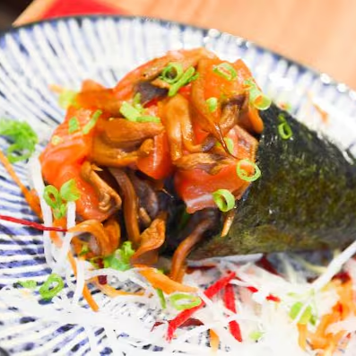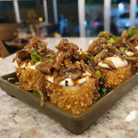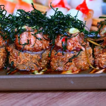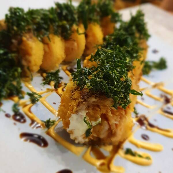 Legumes desfiados temperados e alga japonesa, enrolados por arroz, empanados e fritos, coberto (ou não) por cream cheese e gergelim.