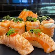 Combinado pra quem quer só salmão e nada mais! 16 sashimis de salmão, 10 uramakis Filadélfia, 6 niguiris de salmão - 3 barriga e 3 Skin -, 4 gunkans de creamcheese, 4 gunkans shake e 10 hots.
