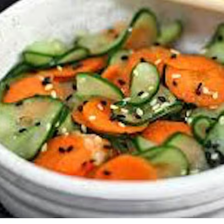 Lâminas de pepino e cenoura, marinados em molho doce avinagrado.