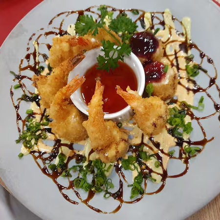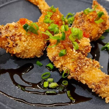 Um dos queridinhos e mais vendidos da casa. Lâmina de barriga de salmão, recheada com camarão, cream cheese e cebolinha, envolta em massa harumaki, tudo empanado e frito.