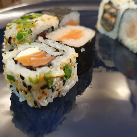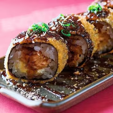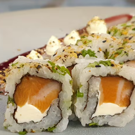 Sushi recheado com cream cheese e salmão, empanado e frito.