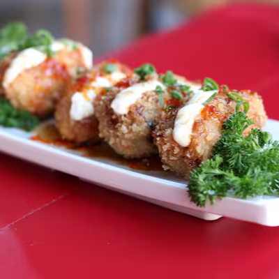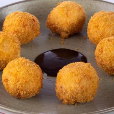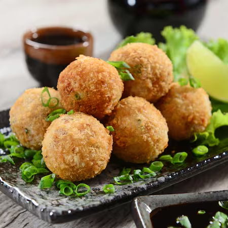 Delicie-se com bolinhos de salmão temperados, crocantes por fora e macios por dentro, oferecendo um sabor intenso e perfeitamente equilibrado.