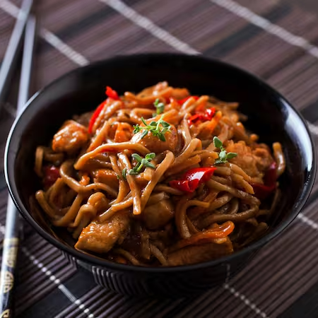 Delicioso prato oriental de macarrão, molho, frango e legumes. 400g. Serve 1 pessoa (400g)
