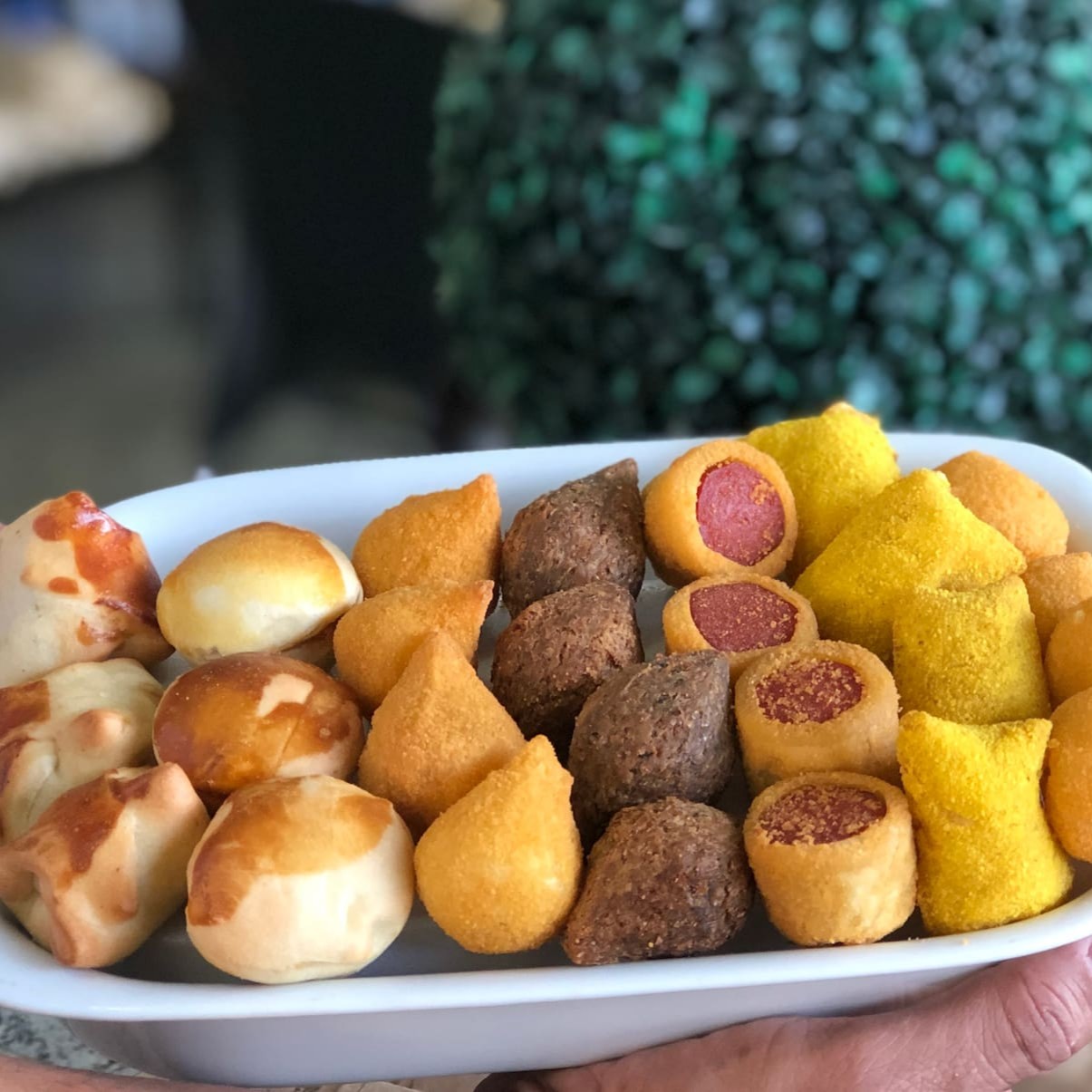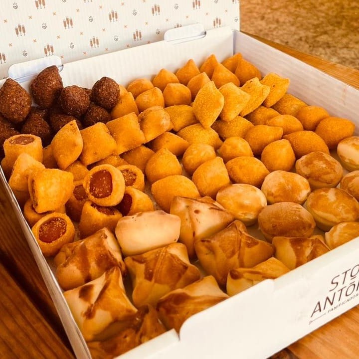 50 Salgadinhos Sortidos Bem Temperados, Ideais Pra Lanche ou Mini Festa. Não Fazemos Alteração: 10 Coxinhas, 6 Quibes, 6 Risoles de Carne, 6 Risoles de Milho, 6 Empanados de Salsicha, 6 Bolinhas de Presunto e Queijo, 5 Empadinhas de Frango e 5 Esfirrinhas de Carne.