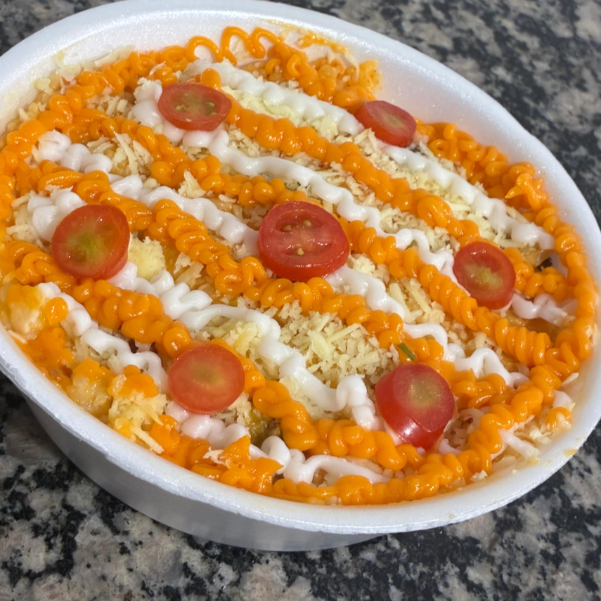 Acompanha: arroz, camada de mussarela, catupiry , cheddar, filé de frango, linguiça de frango, requeijão cremoso , tomate e nosso tempero especial da casa.