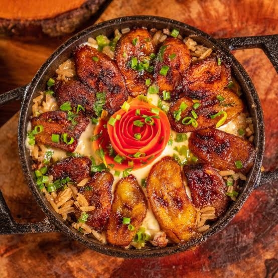 Acompanha arroz cremoso , costelinha suina , linguiça suína , bastante mussarela , palmito tomate e banana e o tempero especial da casa .