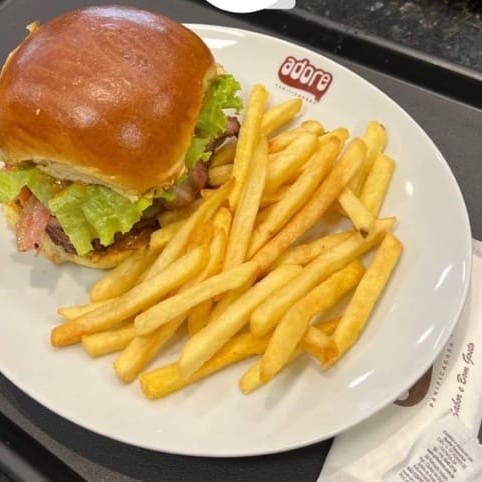 Pão Francês Adore ,Molho adore, Hamburguer adore, Cebola caramelizada, Queijo cheddar, Alface