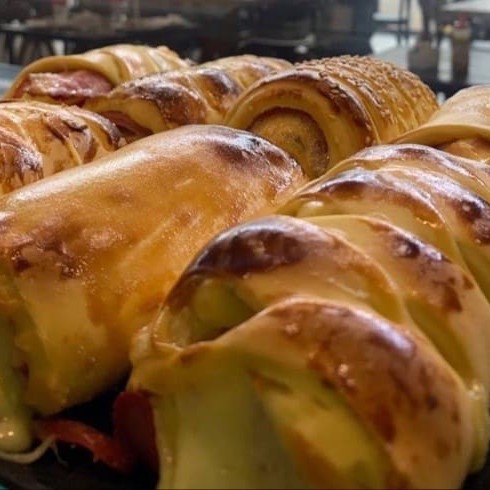 Salgado com recheio de salsicha, presunto, queijo e bacon