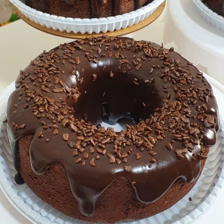 Bolo de chocolate fofinho com cobertura de chocolate e granulado, rende em media 8 fatias