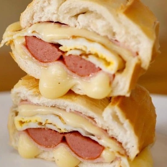 Pão francês , 2 fatias de presunto , 2 fatias de mussarela , 1 ovo e 1 salsicha