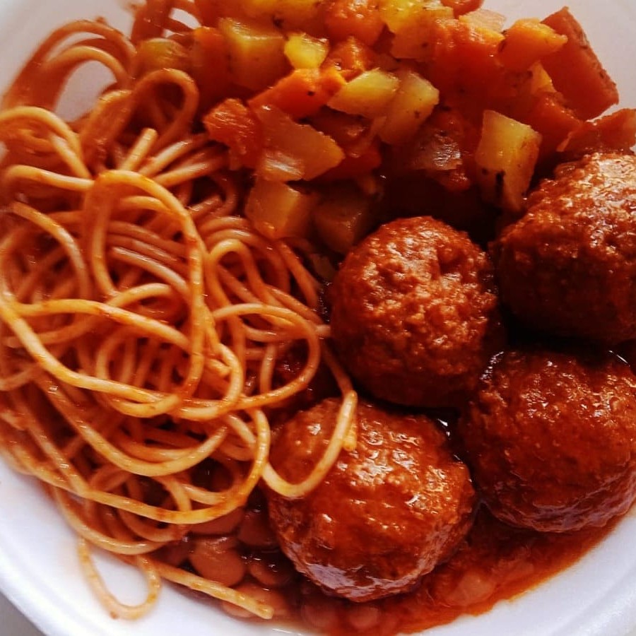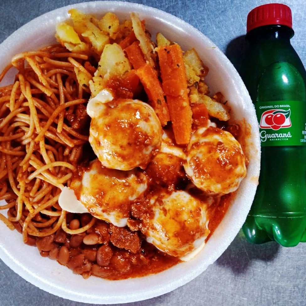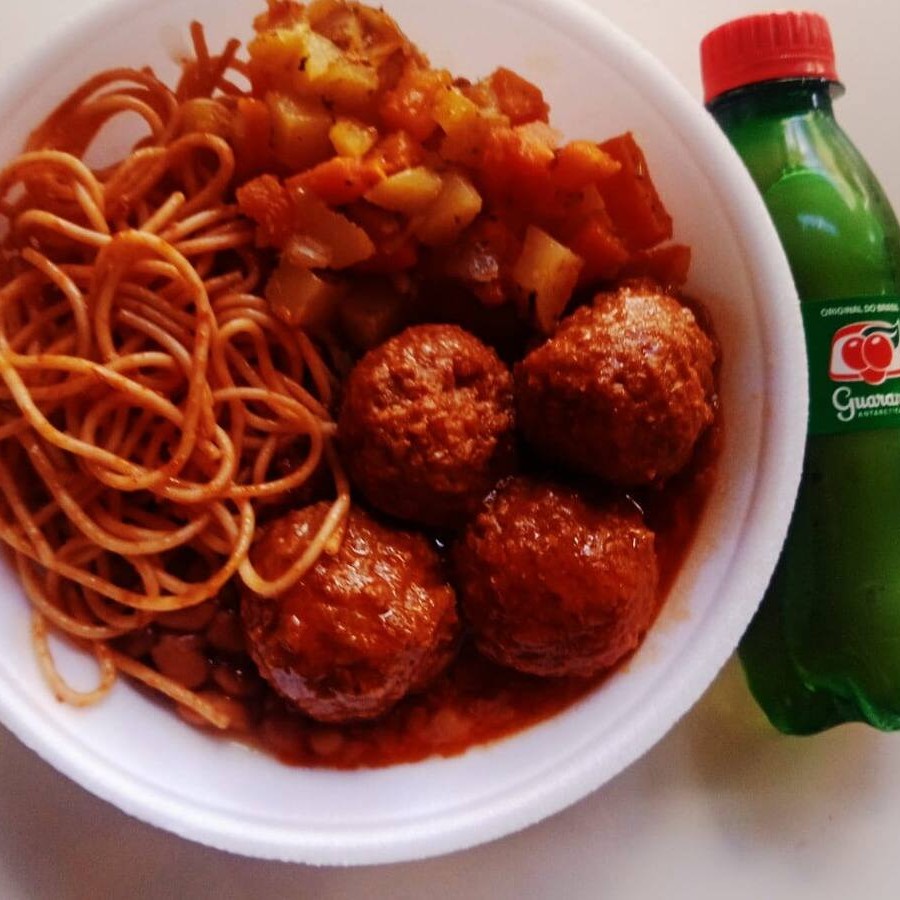Executiva de almôndegas de carne vem acompanhada de arroz branco, feijão de caldo , macarrão ,cenoura e batatinha cozida
