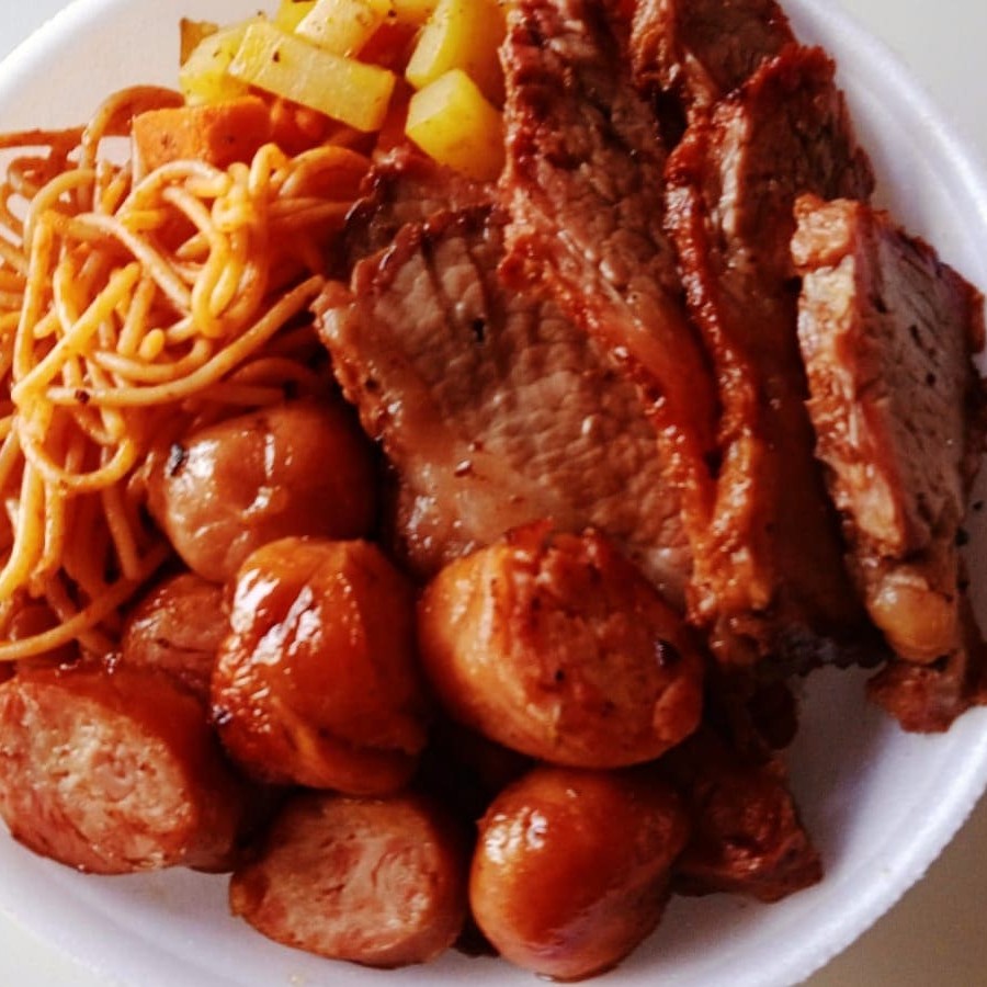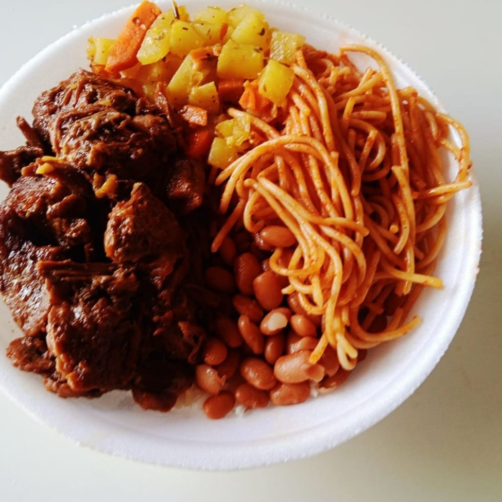 Carne de panela acompanha arroz, feijão de caldo,macarrão, cenoura e batatinha cozida,