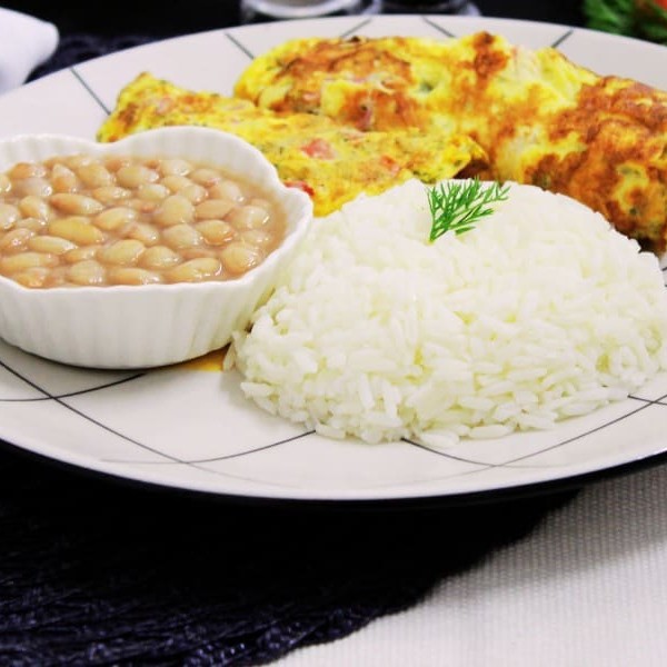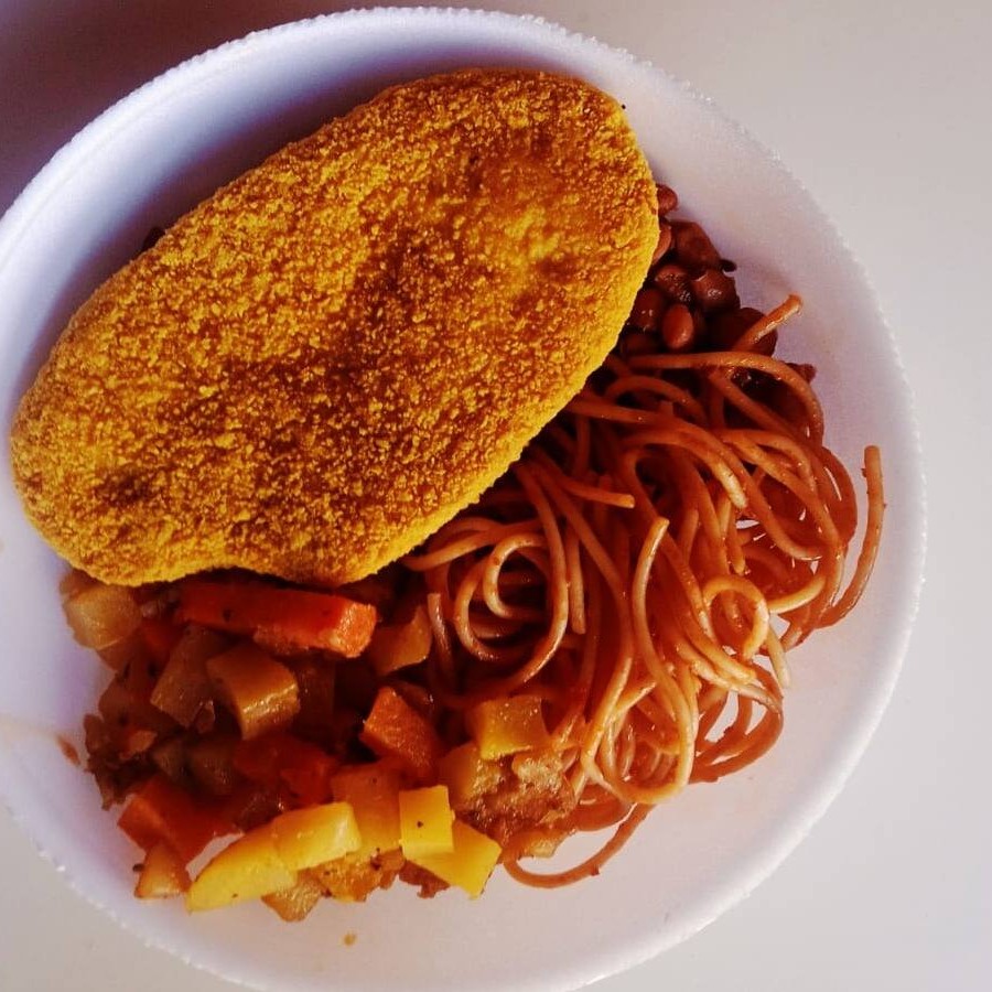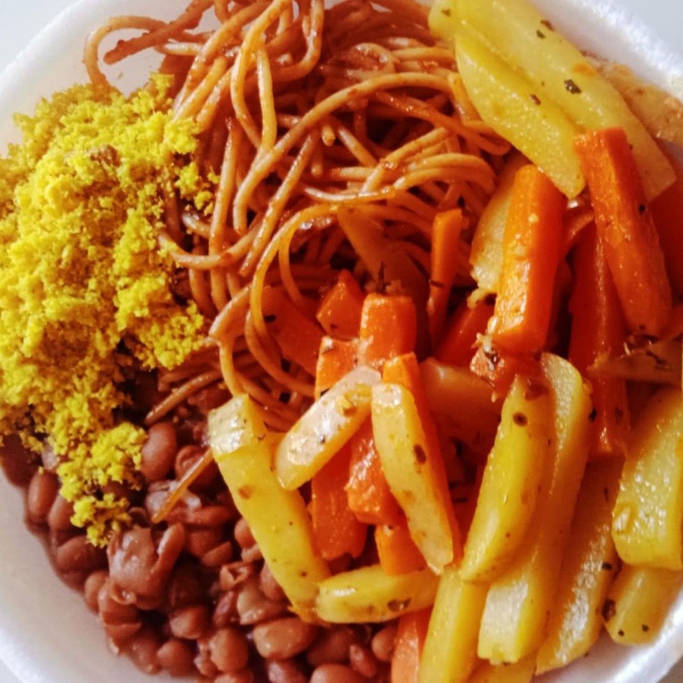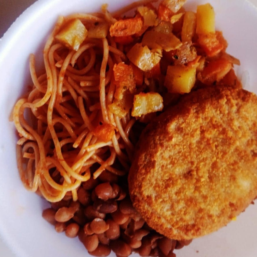 Para você que não quer carne, ela vem acompanhada de arroz, feijão de caldo, macarrão, cenoura e batatinha cozida