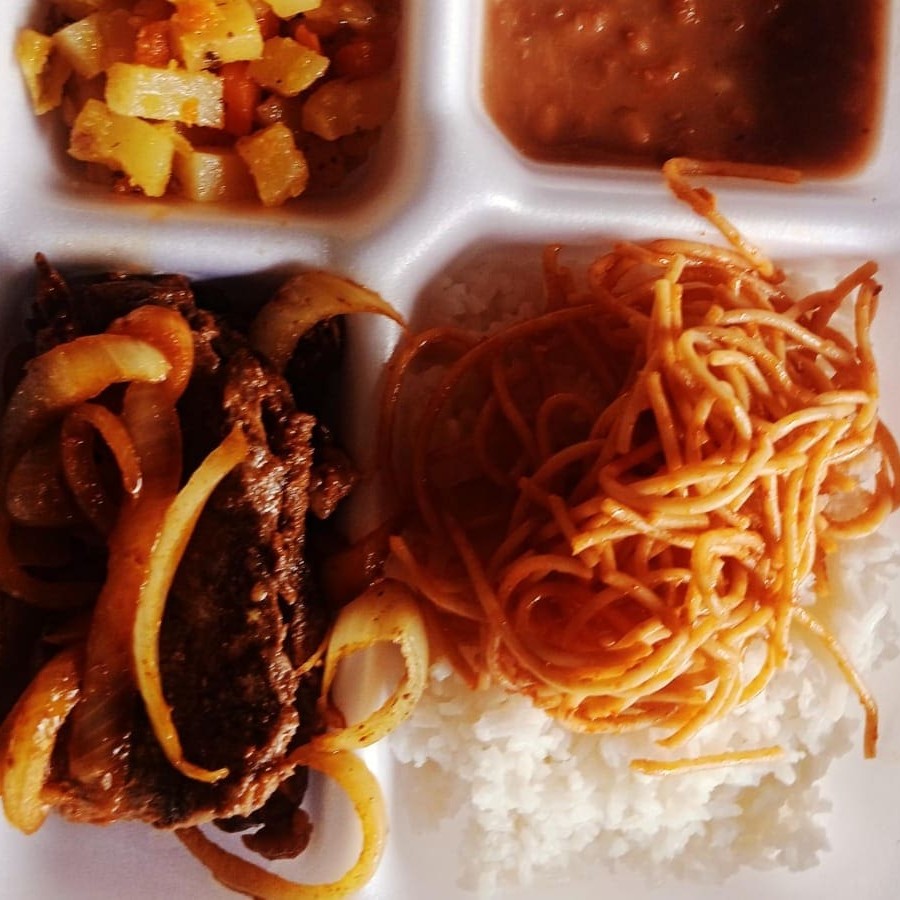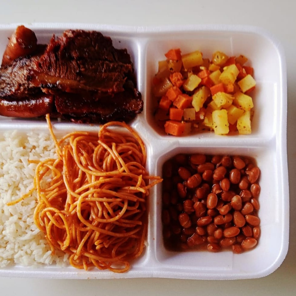 Executiva de bife com 4 divisória acompanha arroz, feijão de caldo, macarrão, cenoura e batatinha cozida