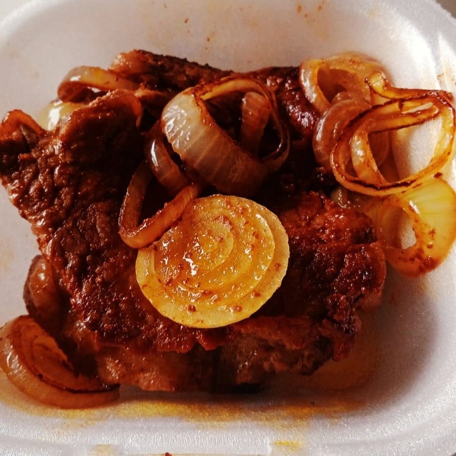 O bife acompanha arroz,feijão de caldo,macarrão,cenoura e batatinha cozida.