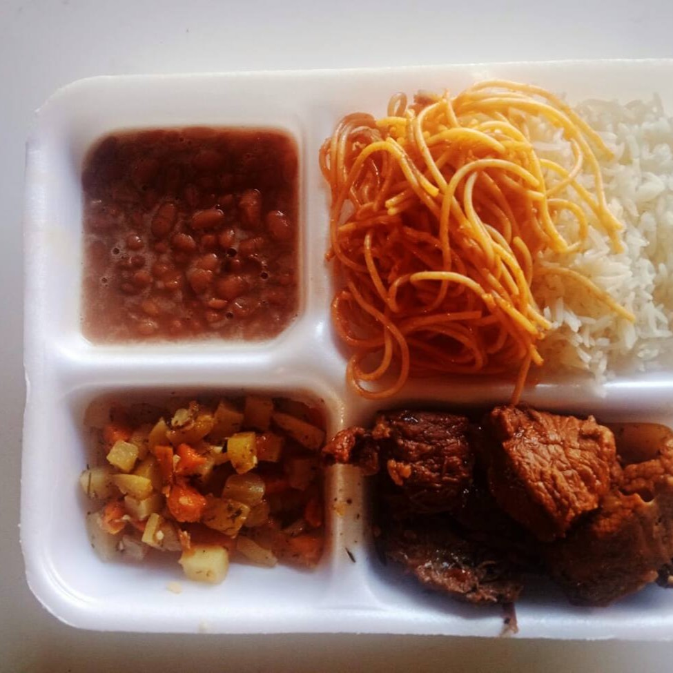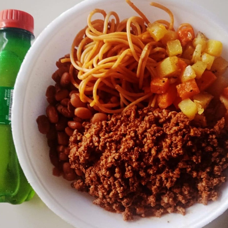 Carne moída ao molho vem acompanhada de arroz, feijão de caldo, macarrão e verduras
