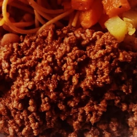 Carne moída ao molho acompanha arroz, feijão de caldo,macarrão, cenoura e batatinha cozida