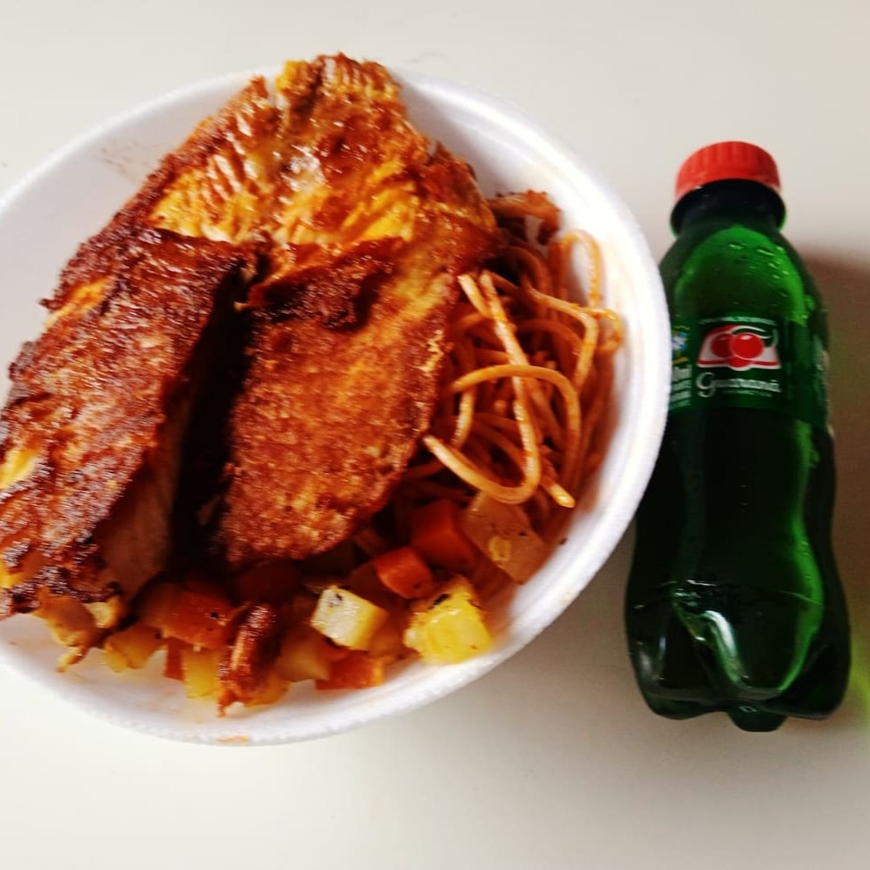 File de tilápia frita acompanha arroz, feijão de caldo ,macarrão , cenoura e batatinha