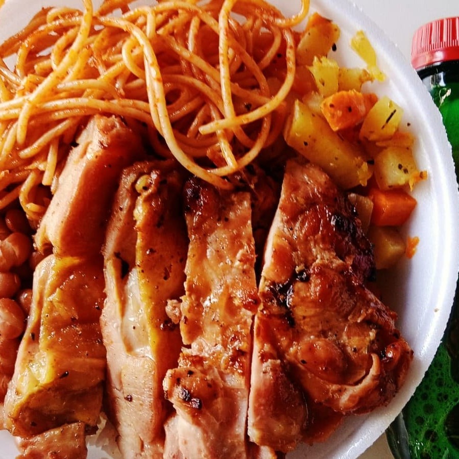 Coxa sobrecoxa assada na brasa acompanha arroz, feijão de caldo, macarrão e verduras