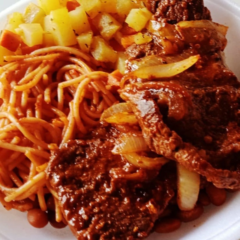 bife contra filé acompanha arroz, feijão de caldo ,macarrão, verduras (batatinha e cenoura)
