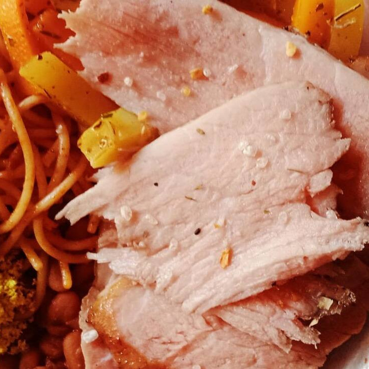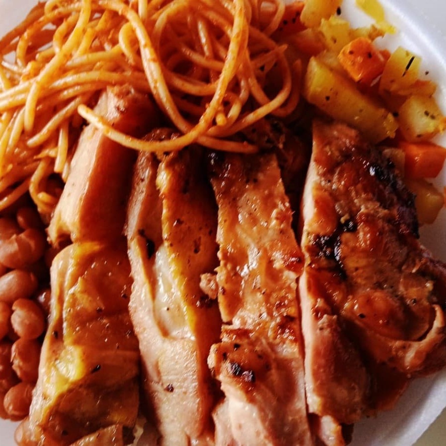 alcatra suína assada ao bafo acompanha arroz ,feijão de caldo ,macarrão e verduras
