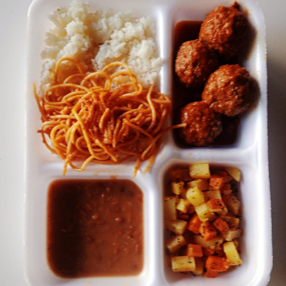 Almôndegas vem acompanhada de arroz, feijão de caldo, macarrão, cenoura e batatinha cozida