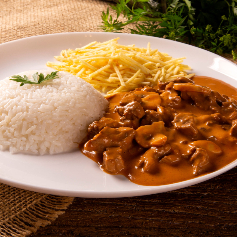 strogonoff de carne acompanhada de arroz e batata palha separada